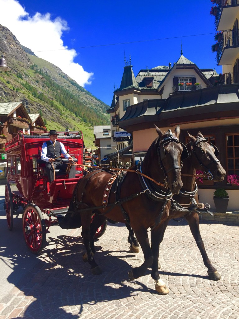 * You may even pay for a a horse carriage to pick you up at the train station going to the hotel, even if the distance is only some 700 meters. Normal cars are forbidden in Zermatt. Only electric vehicles are allowed in the center of town.