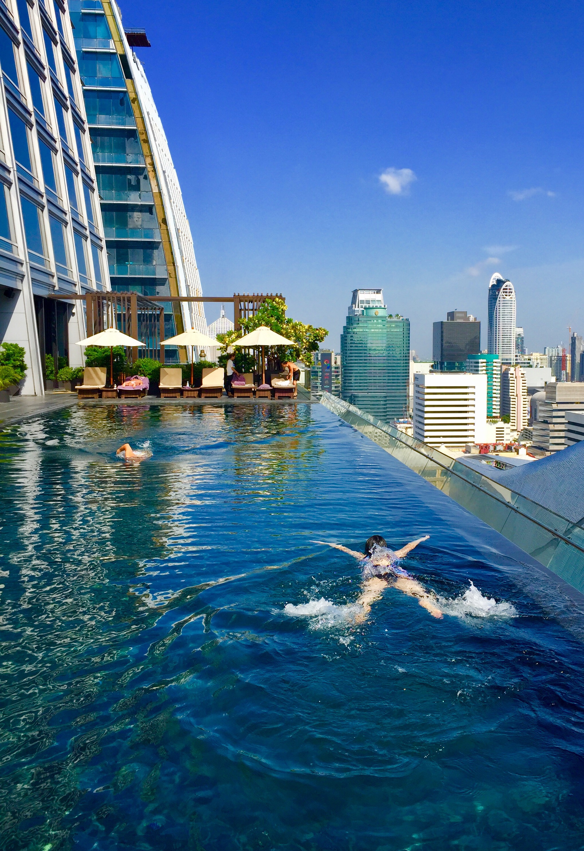 But don’t be afraid, there is a hidden ledge below the pool edge, even if you really don’t see anything but blue water, blending perfectly with the Bangkok skyline.